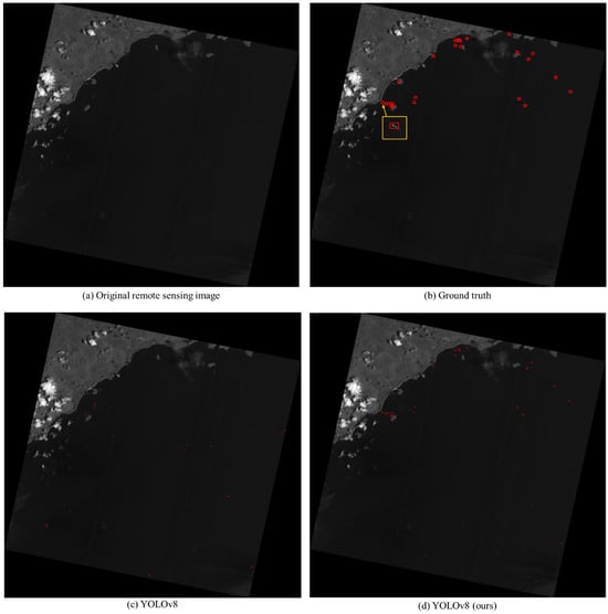 Figure 8 shows the promising performance of our method in mitigating false alarms induced by cross-modal images. Next, we demonstrate the performance of our method in detection accuracy. The Figure 9 image was also observed by GaoFen-3 with a resolution of 0.75 m, and two adjacent views of images have been stitched together using longitude and latitude information that causes rotation of the image, and the size of original remote sensing image was 22,352 × 21,478. As shown in Figure 9b, 24 ships exist according to manually checked results using the AIS data. Figure 9c shows the detection result of conventional YOLOv8, which has the most satisfactory results of the detection backbone networks on average, with 12 positive true detections, 12 false-negative detections and 54 false-alarm detections, and the detection recall and mFAR are 50% and 14.95%, respectively. Figure 9d shows the detection result of same structure with the YOLOv8 network using our method, with 20 positive true detections, 4 false-negative detections and 7 false-alarm detections, and the detection recall and mFAR are 83.33% and 1.64%, respectively. From the results, we can find that both the detection accuracy and false-alarm rates are influenced by cross-modal images, causing significant performance degradation in real PAN images. Our method can effectively reduce the influences of different cross-modal images, holding a satisfactory detection accuracy and effectively mitigating false alarms, which verify the efficiency and applicability of the proposed method.
