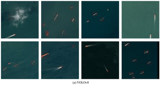 The training dataset consists of color images and the real remote sensing image is a PAN image. The detection backbone network is chosen from Mask-R-CNN [], Deformable DETR [], YOLOv5 [] and YOLOv8 [], which are the most widely used network forms in ship detection from remote sensing. The experiments are conducted on a high-performance workstation equipped with a 24 GB Nvidia RTX 4090 GPU.