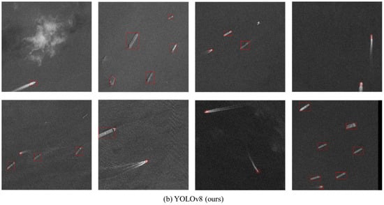 The results of the training dataset of the Kaggle Ship Detection Dataset are as shown in Figure 10. The detection results from the original YOLOv8 and from YOLOv8 with our framework are shown in Figure 10a,b, respectively. From Figure 10a, we can observe that original YOLOv8 has satisfactory detection accuracy, most ships are detected with little false-alarm targets. Since front augmentation is used, the original images are transferred to single channel patterns as shown in Figure 10b. As observed, detection accuracy in training dataset slightly decreased while the false-alarm rate also decreased in our framework. And generally, the detection accuracy is still satisfactory with higher mAP (mainly caused by the decreasing false-alarm rate). Here, we note that the detection accuracy in training dataset may not further increase; however, the performance in the training dataset is not our main concern, as our aim is to use the large color-image dataset for training ship detection network instead of the barely available PAN datasets. And the presented results show that the detection accuracy of our method is still satisfactory.