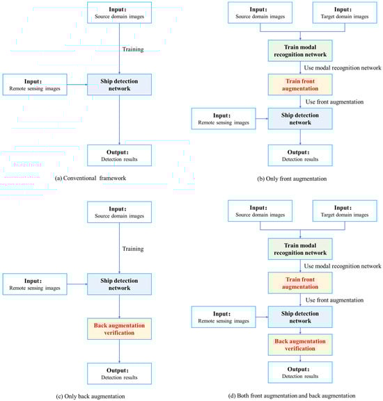 To solve these problems, this study proposes a double augmentation framework for ship detection in cross-modal remote sensing imagery. The proposed method can be divided into two main steps: front augmentation in the training process and back augmentation verification in the detection process. The front augmentation acquires a transformation relation for training that uses a modal recognition network to reduce the modal difference in training and when using a detection network. After achieving a detection network, the back augmentation verification uses batch augmentation and results clustering to reduce the false-alarm rate and improve the detection accuracy. Real-satellite-sensing experiments have been conducted to demonstrate the effectiveness of our method. The experimental results show that the proposed method can generate the closest result to the ground truth, despite the huge differences between the multi-spectral (color) image in training and the panchromatic (PAN) image in testing.