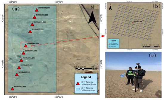 The laser altimeter’s ranging calibration study area, as presented in this paper, is situated within a specific section of the Xilingol League in the Inner Mongolia Autonomous Region of China, as shown in Figure 3a. The geographical coordinates for this region span from 42.75°N to 42.89°N and from 112.46°E to 112.53°E, covering an area of approximately 80.38 km2. The dominant landscape feature is the Gobi Desert, known for its level terrain, which substantially aids in the positioning and gathering of ground control point data. The selection of this terrain for our study is predicated on its suitability for the environmental conditions required for ranging calibration. The Gobi Desert’s characteristics ensure precise measurements and clear identification of control points, while the flat terrain streamlines the measurement process and enhances the efficiency of data collection. These attributes provide a compelling rationale for selecting this location for the ranging calibration efforts.