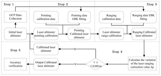 In the realm of geometric calibration for laser altimeters, current methodologies are unable to satisfy the stringent high-frequency and high-precision in-orbit calibration demands of laser altimetry satellites [22]. Consequently, this paper introduces an advanced calibration method for spaceborne laser altimeter pointing and ranging that utilizes dense control points. Initially, the positions of laser footprints are identified based on their distribution within the designated pointing and ranging calibration areas. Ground control point data, centered around these laser footprints, are collected, and the discrete points are integrated into continuous simulated surface data via empirical Bayesian kriging. These data are subsequently categorized into two sets: one for pointing calibration and another for ranging calibration, tailored to their respective functions. Following this, a sequence of calibration experiments is conducted, adhering to a strategic “pointing-ranging” order. The pointing calibration is undertaken first to ascertain the precision of the laser altimeter’s directional pointing, followed by the ranging calibration to enhance the accuracy of the laser range measurements. It is important to note that this series of experiments is iterative rather than a single-step process. Specifically, the ranging calibration is repeated until the variation in the adjusted laser ranging value post calibration is ≤0.001 m. This paper employs the GF-7 satellite laser altimeter as the experimental subject and validates the proposed method by drawing comparisons with the calibration results obtained using laser infrared detectors, which are accepted as the reference standard for the GF-7 laser altimeter in this investigation.