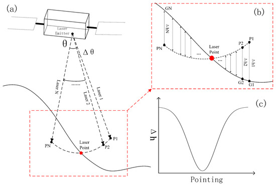 In Figure 5b, P1, P2, …, PN represent the positions of laser footprints located at different pointing angles. G1, G2, …, GN denote the ground locations corresponding to the latitude and longitude of the located laser footprints. , express the elevation differences between the laser footprint positions and the corresponding ground points for different pointing positions.