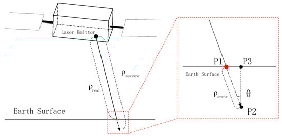 As depicted in the figure, represents the laser ranging value used for laser footprint positioning, while represents the true laser ranging value from the laser transmitter to the ground. represents the true position of the laser footprint on the ground, denotes the position calculated by the laser footprint positioning model, and is a ground point with the same latitude and longitude as . represents the angle between the laser and the vertical line on the ground, including the angle at which the laser transmitter is installed and the satellite yaw angle. represents the laser ranging error, and its calculation formula satisfies
