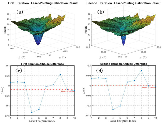Results of the two iterations of laser altimeter pointing and ranging calibration. (a) represents the results of the first iteration of pointing calibration, while (b) represents the results of the second iteration of pointing calibration. (c) represents the results of the first iteration of ranging calibration, and (d) represents the results of the second iteration of ranging calibration. In (c,d), the blue lines represent the elevation difference at different laser points, and the red dashed lines represent the average elevation difference.