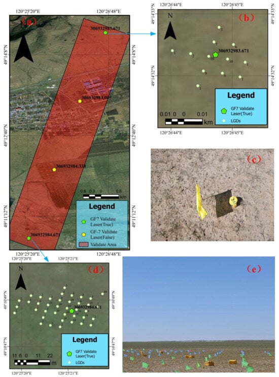 Laser validation area and data. (a) displays the laser validation area and the positions of the GF-7 validation laser footprints. The green laser footprints represent successful captures by the detector, while the yellow ones indicate that they were not captured. The red area represents the validation region. (b) illustrates the positions of laser footprint 306932983.671 and the detector, with the numerical values indicating the laser trigger energy. (c) displays the laser infrared detector used in this experiment. (d) shows the positions of laser footprint 306932984.671 and the detector, with the numerical values indicating the laser trigger energy. (e) presents a real-life image of the detector deployment in this experiment.