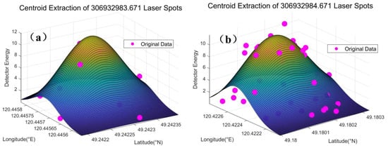 Centroid extraction of ground detectors. (a) shows the centroid extraction of the detector that captured laser footprint 306932983.671. (b) illustrates the centroid extraction of the detector that captured laser footprint 306932984.671.