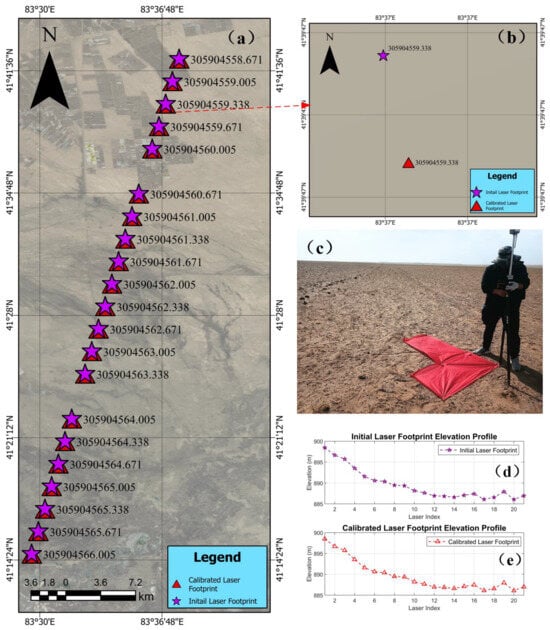 Distribution of elevation-validated laser footprints. (a) shows the approximate distribution of the initial laser footprint and the calibrated laser footprint. (b) shows the planar positions of the laser footprints before and after the calibration with a value of 305904559.338. (c) is a photo taken during the RTK measurement. (d,e) show the changes in the elevation of the laser footprints before and after calibration.