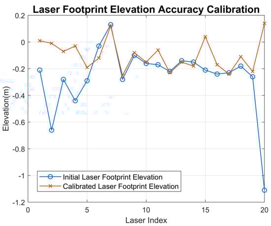 In the table, the “Initial” column lists the position data of the laser footprints using the original spaceborne laser altimeter parameters (those from 2022). The “Calibration” column contains the position data of the laser footprints post calibration. Latitude (), longitude (), and altitude () correspond to the respective coordinates of the laser footprints. “GCP_H” denotes the altitude of the ground control points collected by RTK. The symbol indicates the discrepancy between the altitude of the laser footprints and that of the GCPs. According to Table 5, the average altitude discrepancy between the laser footprints and the GCPs before calibration stood at −0.26 m, with an elevation accuracy of 0.36 m. Following calibration, we notice a marked improvement in elevation accuracy. The average altitude error is reduced from −0.26 m to just −0.01 m, and the elevation accuracy is enhanced from 0.36 m to 0.15 m—translating to a 58.33% increase in precision. Figure 12 illustrates the alterations in the elevations of the laser footprints as a consequence of the calibration process.