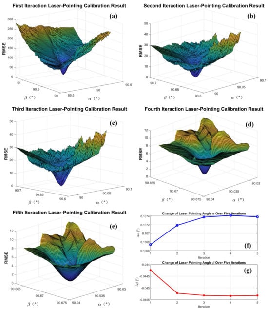 Results of the five iterations of pointing calibration and the variations in the pointing angles and . (a–e) represent the results of the first to fifth iterations of pointing calibration, respectively. (f) illustrates the variation in the laser pointing angle during the five iterations, while (g) shows the variation in the laser pointing angle during the five iterations.