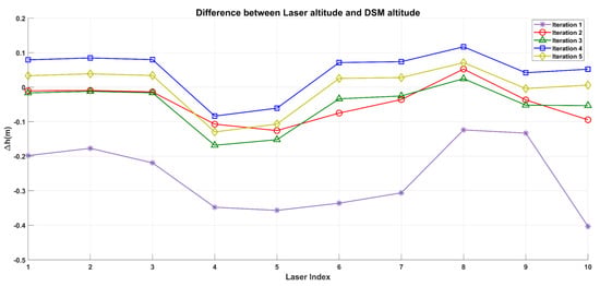 In Figure 14, represents the elevation difference between the laser footprint and the simulated ground elevation, and Laser Index refers to the ten laser footprints used for laser range calibration. Since the initial range correction value is set to 0, the elevation difference between the laser footprint and the simulated ground is initially large during the first iteration. As the iterations progress, the elevation difference gradually decreases and hovers around 0. Table 6 presents the variations in the laser range correction values for the five iterations.
