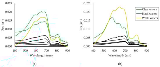 Examples of Rrs collected in different sections of the Negro River (black-water), its tributaries (black- and clear-water), and the Amazon River (white-water). (a) High-water period; (b) low-water period.