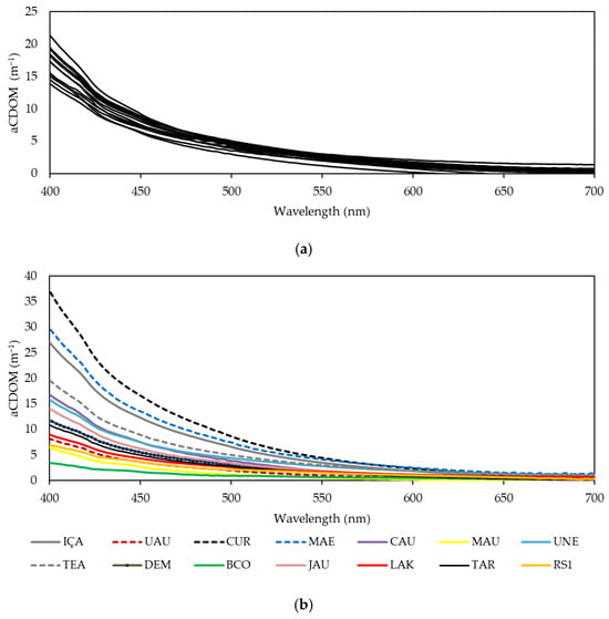 In the dataset of the Negro River (Figure 3a), the aCDOM at 440 nm exhibited an average value of 8.97 m−1, ranging from 6.10 m−1 (station RN6) downstream of the confluence with the Branco River to 10.64 m−1 (station RN9) downstream of the Jaú River. In the stations located in the tributaries (Figure 3b), were observed average values of aCDOM at 440 nm of approximately 5.39 m−1, but with a greater range, varying from 0.61 m−1 (BCO station) in the Branco River to 18.80 m−1 (CUR station) in the Curicuriari River, respectively. The ratio between maximum and minimum values of aCDOM at 440 nm was approximately 10.22, indicating a high spatial variability of CDOM in this basin.