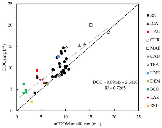 DOC versus aCDOM in the Negro River Basin. The dashed black line indicates a 1:1 relationship. Please refer to Table 1 for the names of the sections.