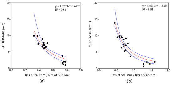 Relationship between aCDOM at 440 nm and the ratio of Rrs for MSI bands simulated at 560 nm and 665 nm in the high-water period (a) and low-water period (b). The blue lines are 95% confidence intervals.