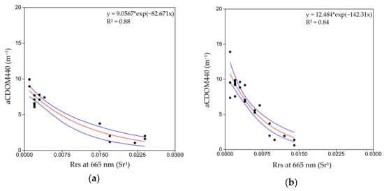 The relationship between aCDOM at 440 nm and the Rrs for MSI band simulated at 665 nm for the high-water period (a) and low-water period (b). The blue lines represent the 95% confidence intervals.