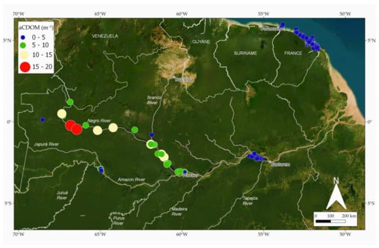 Figure 7 shows the longitudinal distribution of average CDOM along the Negro River, Amazon River, and the coast of French Guiana, highlighting aCDOM at 440 nm values exceeding 10 m−1 along the entire Negro River, except for data observed in the Uaupés River, an upper-course tributary. It is interesting to note that the aCDOM values of the Amazon River are not affected by the input of CDOM from the Negro River, indicating that the high concentrations of total suspended solids in white-water rivers of the Amazon River mask the spectral signature of CDOM [,]. Indeed, the area drained by the Amazon River upstream from the mouth of the Negro River contributes significantly to the dissolved organic matter exported to the ocean, but CDOM does not dominate the spectral response.