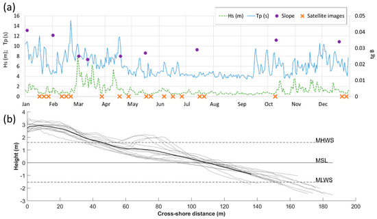 (a) Wave data (daily maximum Hs and Tp, presented as dashed green and solid blue lines) from the modelled point SIMAR 6012044 (see location in Figure 1) from Puertos del Estado (https://www.puertos.es/, accessed on 9 January 2023) together with the beach-face slope estimated from topographic surveys (purple dots) and the availability of S2 satellite images (orange crosses). (b) Topographic profiles from 2018 field surveys (average profile highlighted as a thick black line), and values for the Mean High Water Spring (MHWS) and Mean Low Water Spring (MLWS).