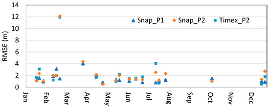 Differences in the spatial location of the VDWLs expressed as RMSE (in m) defined by the two photo-interpreters (P1 and P2) from both types of images (Timex and Snap). The differences were calculated for the studied dates considering the first photo-interpreter (P1) and the Timex images as the reference.