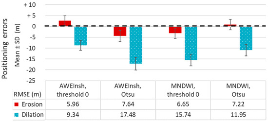 The application of the erosion filter over the water mask instead of the dilation leads to an APS shifted one pixel seaward. This compensates for the lack of a clear water/land boundary that usually tends to displace the SDWL position landward and minimises the bias of the final SDWL. Although C4 (3 × 3, Erosion, MNDWI, Otsu) leads to a lower bias landward (0.82 m), the higher SD translates into a worse level of accuracy (7.22 m RMSE). When the AWEInsh index is capable of correctly assigning positive (negative) values for the land (water), the thresholding employing a constant value of 0 seems the most simple and convenient solution to achieve a good positioning of the APS. On the contrary, when the water/land distinction is not properly accomplished, the Otsu method appears as a useful alternative. When combined with the MNDWI index, Otsu offers the best results. This method computes the optimal threshold value by analysing the distribution of pixel intensities in the image [21]. This adaptability makes it more suitable for images with varying lighting conditions and content, which probably did not constitute a significant advantage in the present assessment, considering the small size of the site and the lack of cloudy images.