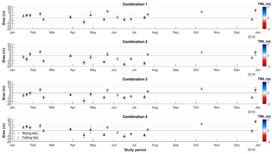 Errors (as bias ± SD, in m) of the resulting waterlines for combinations 1–4 of extraction parameters. The total water level (TWL) is presented in different colours, while the different symbols describe the rising (triangle pointing upwards) and falling tide (downwards) conditions.