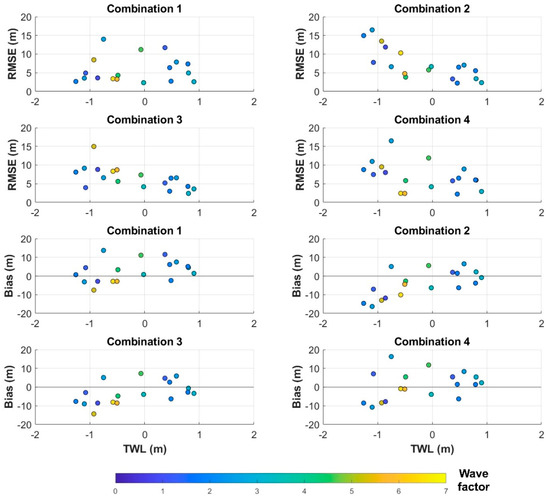 Relationship between tide level and the waterline errors, defined by the bias and the RMSE for the combinations 1–4 of extraction parameters. The wave factor (as the product of Hs and Tp) is presented by the different colours of the points.