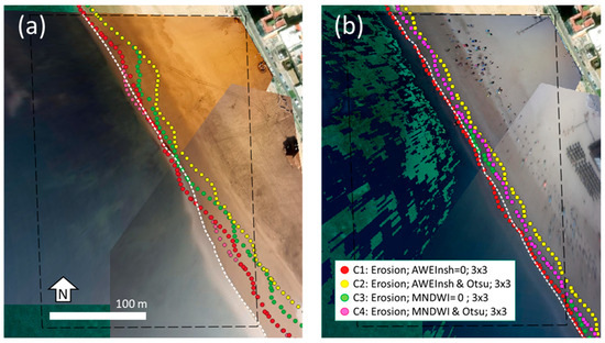 Satellite-derived waterlines extracted with the combinations 1–4 of extraction parameters together with the VDWL (white dashed line) on different dates: (a) 27 April 2018, Timex image. Note the high coincidence and overlapping of the points composing the SDWs when using C2 and C3. (b) 22 May 2018, Snap image. Background: orthophotograph PNOA 2019.