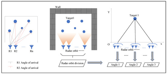 Figure 1 shows the multi-angle observation method used by a radar system as it moves an orbit. On the left side of the figure, a small blue antenna (radar) is shown at various points along the orbit, each point providing a unique observation angle towards the target. This arrangement allows the radar to gather echo data from the same target at different angles. The middle part of the figure illustrates the radar moving uniformly to the right along the orbit within an environment bounded by walls. In this scenario, electromagnetic waves undergo refraction, generating multipath effects between the targets and the walls and between the targets. The radar collects echo data representing multiple angles as it covers the entire orbit. The right section of the figure demonstrates the selective extraction of specific angles from the overall data. It illustrates this selection by showing three angles: Angle1, Angle2, and Angle3. This method is also applicable to situations with more than three angles, this paper uses three angles as an example to analyze.