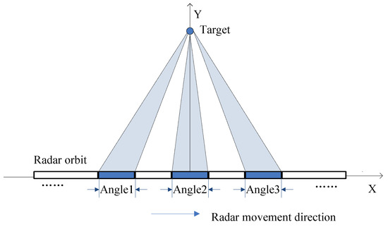 The geometric model of multi-angle radar observation is shown in Figure 2, where the black bold rectangle on the X-axis represents the orbit of radar movement. A right-angled coordinate system is established with the center of the orbit as the origin, extending to the right as the positive X-axis and upward as the positive Y-axis. The target location is marked by a blue circle, and the radar antenna, pointed at the target, emits frequency modulated continuous wave (FMCW) signals at regular intervals. Selected angles from the collected echo data, such as Angle1, Angle2, and Angle3, are then processed through subsequent algorithmic steps.