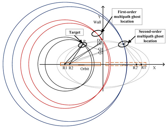 For the first-order multipath analysis, the radar and virtual radar together emulate a two-station measurement mode. Lines from radar points R1 and R2 to point intersect the Y-axis at Q1 and Q2. In this scenario, the order of electromagnetic wave propagation along the path segments does not change the result because the total path length is the same regardless of whether the wall refracts the electromagnetic wave or passes through the target first. In this two-station observation mode, elliptical equidistant contours are formed, with ellipses drawn using R1, , and R2, as focus and point as the moving point. These ellipses intersect the wall at points D1 and D2. Circles are then drawn with R1 and R2 as centers and the distances to D1 and D2 as radii, as shown by the two red circles in Figure 4. Their intersections indicate the positions of the first-order multipath ghost images.
