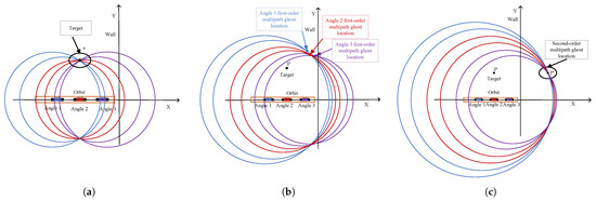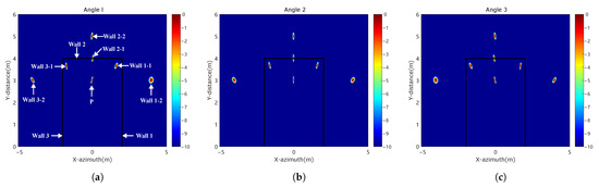 In Figure 5, three observation angles, Angle1 (blue), Angle2 (red), and Angle3 (purple), are analyzed with their respective radar position points. For each angle, the analysis focuses on two points at the extreme left and right, as indicated by black dots. Figure 5a shows the direct paths for all three angles converging at the target point P. Figure 5b shows the first-order multipath ghost images for each angle, with their locations varying according to the angle of observation. The ghost image locations for Angle1, Angle2, and Angle3 are represented by blue, red, and purple points, respectively. Figure 5c shows the second-order ghost images located at the external wall’s mirror point .