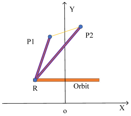 Next, we illustrate the principle of locating the target and its ghost image using the specular reflection from a single wall and two radar position points, R1 and R2. This principle can be similarly applied when considering reflections from multiple walls. As shown in Figure 4, the Y-axis represents the wall within the established coordinate system. The actual orbit of the radar is represented by an orange solid line rectangle on the negative half of the X-axis, while its virtual orbit, a mirror image relative to the wall, is shown as an orange dashed line rectangle on the positive half of the X-axis. The mirror points of radar positions R1 and R2 relative to the wall are labeled and , simulating virtual radars. The target placement point P (, ) and its mirror point relative to the wall, , are also indicated.