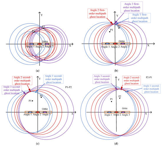Figure 8a establishes the positions of two target points, P1 and P2, through direct paths. Figure 8b shows the first-order multipath ghost images for three different observation angles are determined: Angle1’s ghost image is located at the blue point, while those for Angle2 and Angle3 are indicated by red and purple points, respectively, showing that the first-order multipath ghost images vary with the observation angles. Figure 8c,d analyze the second-order multipath ghost images for two scenarios. In Figure 8c, the first scenario (P1-P2) for the three angles shows second-order ghost images as blue, red, and purple points, and the second scenario Figure 8d illustrates that these second-order ghost images also shift locations with varying radar observation angles.