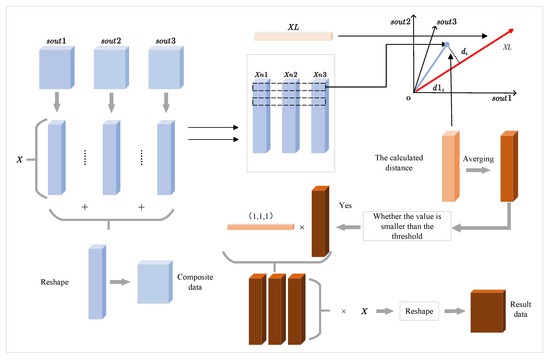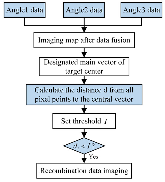 This section processes the echo data from selected angles in the pixel domain. Figure 9 shows the representation of three sub-images in three-dimensional pixel space, corresponding to matrix data , , and . The workflow of the algorithm is shown in Figure 10.