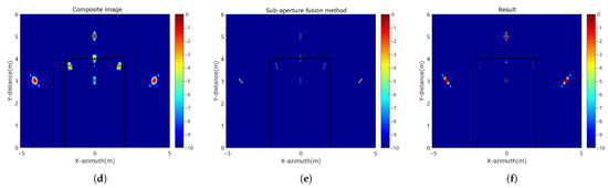 The black lines in the figures represent walls, and the target point is at . Figure 12a–c show imaging results from three angles, with first-order multipath ghost images (Wall1-1, Wall2-1, Wall3-1) and second-order ghost images (Wall1-2, Wall2-2, Wall3-2) indicated by white arrows in Figure 12a. Table 4 lists the central coordinates of the first-order multipath ghost images for the three walls at different angles, showing that their positions vary with the angle. Figure 12d is a composite image of the three angles, where the scattering distribution of the multipath ghost images shows their varying positions at different angles. Figure 12e shows the result of applying the sub-aperture fusion method. This method performs a double-layer fusion of sub-apertures. The first layer multiplies the sub-apertures and the full aperture, and the second layer groups and adds the multiplied sub-apertures. Figure 12f shows the result after suppressing ghost images using the method proposed in this paper, where the first-order multipath ghost images are suppressed, and the second-order ghost images outside the wall are ignored.