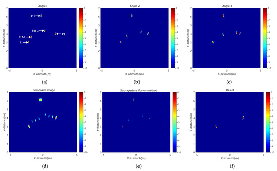 Figure 13a–c show imaging results from three different angles. In Figure 13a, White arrows indicate the first-order multipath ghost image P-1 between the two targets, and the second-order ghost image positions P12-2 and P21-2 from P1 to P2 and P2 to P1, respectively. Table 5 lists the specific coordinates of first and second-order multipath ghost images at different angles, demonstrating that these ghost images change with the radar observation angle. Figure 13d shows a composite image of the three angles, with a scattered distribution of multipath ghost images, indicating their varying positions at different angles. Figure 13e shows the result after applying the sub-aperture fusion method. This method can suppress multipath ghosting but the target information is also lost. Figure 13f shows the image after ghost image suppression using the method proposed in this paper, where only the two target points are visible, and both first and second-order multipath ghost images are completely suppressed, showing significant effectiveness.