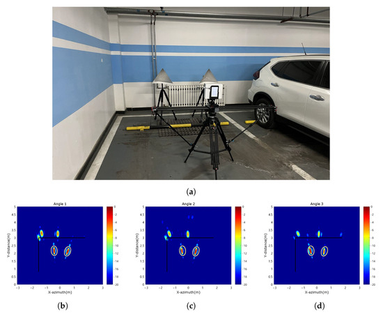 In the experimental arrangement depicted in Figure 15a, a vehicle is stationed in a parking space, with the radar and its orbit placed 2 m directly in front of the vehicle. The vehicle is one parking space away from the left wall, with the rear wall located directly behind the vehicle.