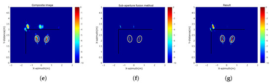 The signal to clutter ratio (SCR) is used to evaluate the processing effectiveness of different methods with real data. Table 8 lists the SCR for different angles, composite image, sub-aperture fusion method, and our method in the two experiments.