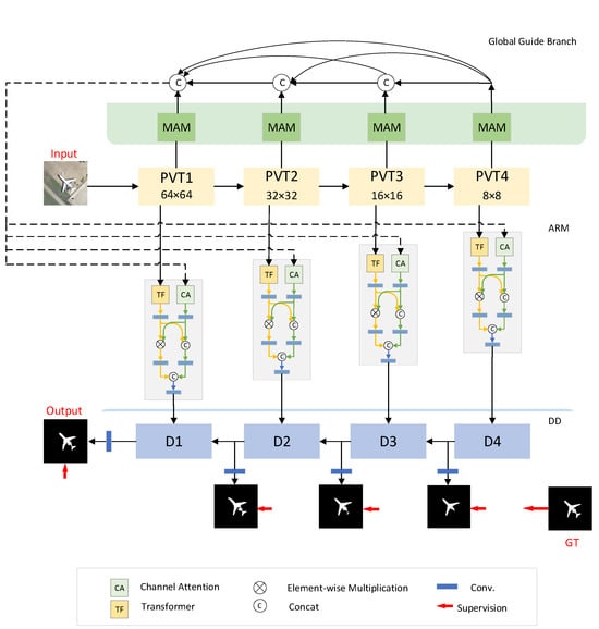 The overall framework of the proposed Global and Multiscale Aggregate Network for Saliency Object Detection in Optical Remote Sensing Images (GMANet). GMANet consists of four main parts: the PVT-v2 encoder, the global guide branch, the Aggregate Refinement Module (ARM), and the dense decoder (DD), where the global guide branch consists of four densely connected multiscale attention modules (MAM). First, four feature maps of different levels are generated by the encoder PVT-v2, which are fed into the Global Guidance Branch (GGB) to learn global context information. The global context information and high-level and low-level features are fused through the Aggregate Refinement Module (ARM) and then input into the Dense Decoder (DD) for further analysis. Notably, in the training phase, we adopt the deep supervision strategy and attach supervision to each decoder block. GT denotes ground truth.