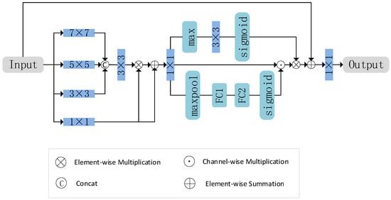 Specifically, the input feature is convolved with convolution kernel sizes of 1, 3, 5 and 7, respectively, to obtain four feature maps of different scales, denoted as , , and . This process can be expressed as: