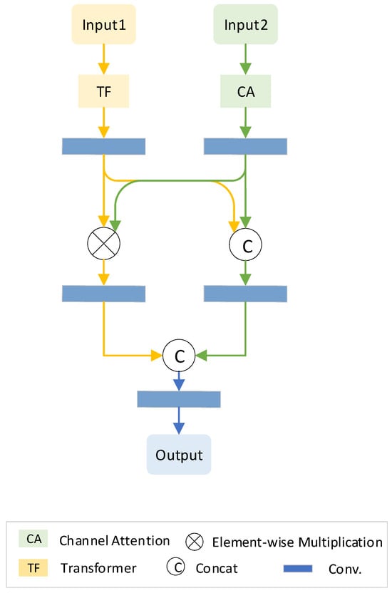 The feature maps generated by the PVT-v2 encoder at different scales represent local details, characterised by intricate details but lacking semantic information, thereby introducing noise. The initial enhancement of is achieved through a Transformer (TF) block, yielding the augmented feature . Simultaneously, the global information generated by the GGB possesses semantic richness but lacks intricate details. To address this imbalance, undergoes a channel attention process [] for channel selection, resulting in the refined feature . Mathematically, this process is expressed as:
