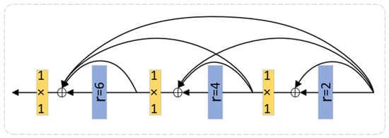 Each dense decoder comprises three DSConvs with dilation rates [] of 2, 4, and 6, alongside three 1 × 1 convolutions. The utilisation of dilated DSConv facilitates an expanded receptive field while concurrently minimising the parameter count. The 1 × 1 convolution functions to amalgamate densely connected features. The input to the dense decoder is denoted as , and the decoding process unfolds as follows: