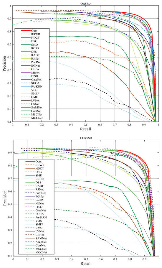 Table 1 provides a comprehensive quantitative evaluation, comparing our proposed method with 28 contemporary approaches across the EORSSD and ORSSD datasets. The assessment is based on key metrics, including , and . Notably, the first five indicators reflect a superior performance with larger values, while the last indicator, M, signifies better results with smaller values. This thorough comparison aims to elucidate the efficacy and competitiveness of our proposed method in relation to existing state-of-the-art techniques.