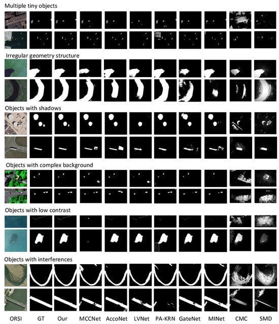 In addition to ORSI-SOD, analogous tasks exist, such as ship detection [,], airport detection [], residential area detection [,], and fuel tank detection [,]. However, these tasks focus on specific objects, unlike the broader and more challenging scenarios addressed by ORSI-SOD.