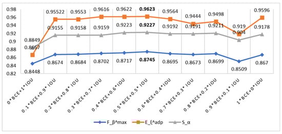 The results in Figure 8 show that with the increase in BCE ratio, the experimental effect is gradually improved, and the best effect is achieved at 50% BCE + 50% IoU. However, as the IoU ratio continues to increase, the experimental effect gradually decreases. This is because the BCE loss provides pixel-wise supervision, and the IoU loss provides map-level supervision, evaluating the similarity of structures. Both are equally important and setting them in equal proportions will provide full supervision of the images. Therefore, we choose the mixed loss of 50% BCE + 50% IoU as the loss function of this method.