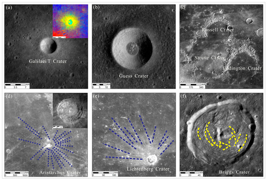 In the Oceanus Procellarum region, there are numerous bowl-shaped and flat-floored craters, which tend to have relatively small diameters. The Galilaei T crater exhibits a representative bowl-shaped morphology in the region, showcasing a well-defined circular shape. False-color images of the crater materials exhibit significant differences from those of the surrounding terrain, indicating variations in elemental and mineral abundances (Figure 1a). Whereas The Guess crater exemplifies a typical flat-floored morphology on the Moon (Figure 1b). Within this area, there are also several impact craters that have been partially or completely inundated by late-stage mare basalts, resulting in the filling of crater floors and some parts of their walls. Notably, only some of the higher rim regions of these craters have remained uncovered. Typical impact craters inundated by mare basalts in this region include the Russell crater, with a diameter of 103 km; the Struve crater, with a diameter of 164 km; and the Eddington crater, with a diameter of 120 km (Figure 1c). Among them, the Struve crater is the largest crater in the area; its crater floor is filled by mare basalts, and it also contains many smaller impact craters that formed later. The Aristarchus crater stands out as one of the most prominent and brightest impact craters on the Moon and is characterized by its prominent rays (Figure 1d). Moreover, the central peak of Aristarchus is predominantly composed of feldspar supplemented by small quantities of pyroxene and olivine [76]. This composition suggests that Aristarchus may have unearthed a feldspar-rich crust during its formation [76,77]. The Lichtenberg crater exhibits typical radial rays, indicating that the impact direction for Lichtenberg was from the southeast (Figure 1e). The Briggs crater’s floor features several irregular fractures of varying sizes, which are arranged in concentric, radial, or polygonal patterns, representing typical geological features of crater floors (Figure 1f).