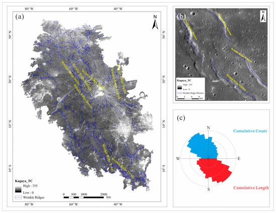 The Dorsa Whiston, located in the Oceanus Procellarum region, exemplifies a typical linear wrinkle ridge with an approximate length of 221 km, as depicted in Figure 2a. In comparison to other regions, the northwestern portion of the Oceanus Procellarum area features a greater density of linear wrinkle ridges [87], as shown in Figure 2b. This observation signifies the prevalent stress and magmatic activity in the area. An analysis of rose diagrams for ridge orientation-frequency and ridge orientation-length cumulations in the Oceanus Procellarum region reveals that the majority of the wrinkle ridges are primarily oriented in the NW–SE direction. Consequently, the formation of wrinkle ridges in the Oceanus Procellarum region is likely influenced primarily by compressional stress in the NE–SW direction. The rose diagrams for ridge orientation-frequency cumulation and ridge orientation-length cumulation in the area point in this direction, implying that the formation of wrinkle ridges in Oceanus Procellarum was primarily controlled by directional compressional stress (Figure 2c).
