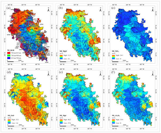According to the Kaguya/SELENE MI false-color composite images, the Oceanus Procellarum region exhibits distinct hues. The northern portion appears orange, denoting a higher iron content, whereas the central and southern areas appear dark blue, signifying a higher titanium content [96]. Notable color variations are observed around the Aristarchus crater (Figure 6a). Elemental abundance maps reveal elevated FeO and TiO2 contents in the central and southwestern parts of Oceanus Procellarum compared to those in the northern area. Furthermore, distinct elemental contents are observed in the Kepler and Copernicus craters relative to their surroundings. The northwestern and northern regions of Oceanus Procellarum exhibit higher MgO and Al2O3 contents and Mg# values. Additionally, enhanced MgO, Al2O3, and Mg# abundances are observed in the Aristarchus, Copernicus, and Kepler craters, as well as some smaller craters, suggesting the excavation of fresh ejecta.