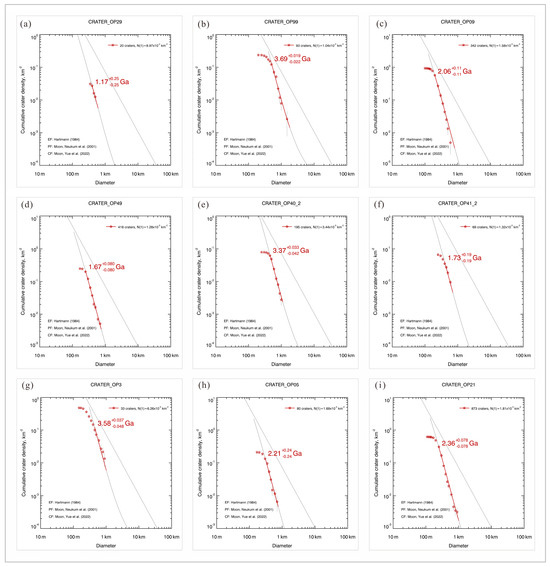 In the Oceanus Procellarum region, the youngest mare basalt unit, OP29, dates back to 1.17 Ga, situated in the northwestern part of the Nielsen impact crater (Figure 6a), corresponding to a small region on the northern side of the Aristarchus Plateau. The most ancient mare basalt unit, OP99, traces back to 3.69 Ga, located in the northernmost part of the region (Figure 6b). Concurrently, younger lunar mare basalt units are predominantly distributed in the central area of Oceanus Procellarum, while older basalt units are concentrated along its periphery. Younger lunar mare basalt units primarily occupy the central region of Oceanus Procellarum, while older basalt units are concentrated along its periphery (Table 1). We obtained chronological results from the landing site of the CE-5 mission, corresponding to OP09, yielding an age of 2.06 Ga (Figure 6c). The landing site of Luna 7 is within the mare basalt unit OP49, with a determined age of 1.67 Ga (Figure 6d). Luna 8′s landing site is within the mare basalt unit OP40, and the determined age in the second dating region of this unit is 3.37 Ga (Figure 6e). Luna 13′s landing site is within the mare basalt unit OP41, revealing a determined age of 1.73 Ga in the second dating region of this unit (Figure 6f). The determined age of unit OP03 is 3.58 Ga (Figure 6g), OP05 is 2.21 Ga (Figure 6h), and OP21 is 3.36 Ga (Figure 6i).
