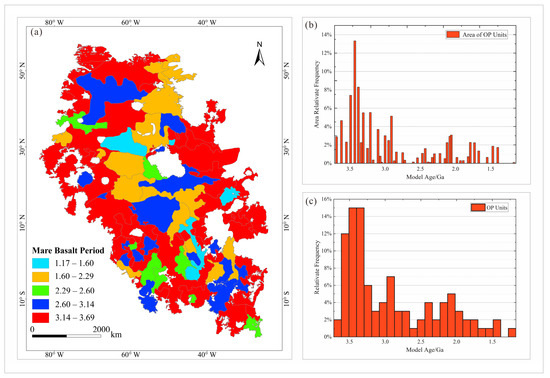 Mare basalts are the products of volcanic eruptions on the lunar surface and serve as tangible evidence of the Moon’s internal thermal evolution [2]. By examining the eruption events and spatial distribution characteristics of mare basalts, we can indirectly deduce the magnitude, duration, and geological progression of the Moon’s internal magmatic activity, either locally or globally. The Oceanus Procellarum region has experienced diverse geological processes, including magma ocean differentiation, crustal plutonic magmatism, volcanic activity, and external meteoroid impact events [3]. CSFD dating results for the Oceanus Procellarum region reveal five major basalt eruption events (Figure 9a). The initial period occurred between 3.69 Ga and 3.14 Ga, when the most extensive eruptions occurred; this eruption encompassed the majority of the Oceanus Procellarum region, with lava flows totaling approximately 1,048,048 km2, accounting for approximately 54.2% of the region’s area. The mare basalt eruption intensity peaked at approximately 3.42 Ga. The subsequent period commenced from 3.14 Ga to 2.60 Ga, when lava flows were primarily concentrated in three extensive areas, covering approximately 353,664 km2 or approximately 18.2% of the region’s total area. The third period spanned 2.60 Ga to 2.29 Ga and was characterized by scattered lava flows distributed across seven mare basalt units, covering a combined area of 104,625 km2 or approximately 5.4% of the total region. The fourth period emerged from 2.29 Ga to 1.60 Ga, encompassing an area of approximately 343,225 km2 or 17.7% of the total region. The final period extended from 1.60 Ga to 1.17 Ga and was primarily distributed across three mare basalt units located on the western side of Kepler crater and on the northeastern and northwestern sides of Aristarchus crater; these units covered an area of 84,157 km2 or approximately 4.4% of the total area. Overall, the mare basalt eruption scale gradually diminished, ultimately ending at approximately 1.17 Ga (Figure 9b,c).